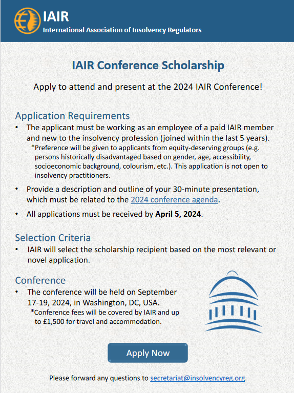 Applications are sought from people working for an IAIR member and they must be new to the insolvency profession. They will also need the support of a contact within the IAIR member organisation - and the organisation will have to be a paid IAIR member.